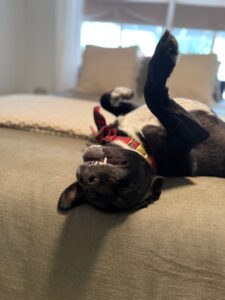 We decided to foster first—but after just two days, we knew he had to be ours. Fitz is quirky, funny, incredibly affectionate, and trusting. What truly won us over was the way his little tongue sticks out when he’s sleepy. He’s the perfect cuddle buddy and loves sitting at your feet, smiling while you scratch behind his ears. Our friends lovingly describe him as “derpy,” and it fits him perfectly.