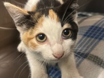 Meet Cider, a sweet and snuggly 1-month-old calico kitten with a beautiful blend of orange, black, and white fur. This tiny girl is full of curiosity and charm, just starting …