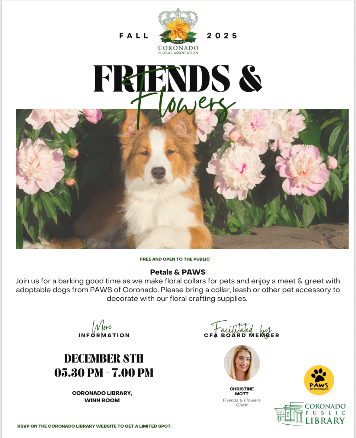 Join us for a barking good time as we make floral collars for pets and enjoy a meet & greet with adoptable dogs from PAWS of Coronado. Please bring a collar, leash or other pet accessory to decorate with our floral crafting supplies.