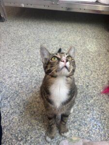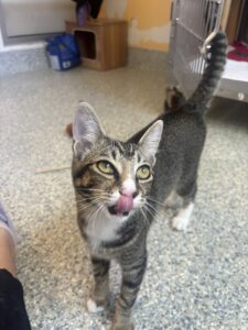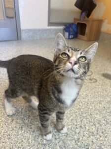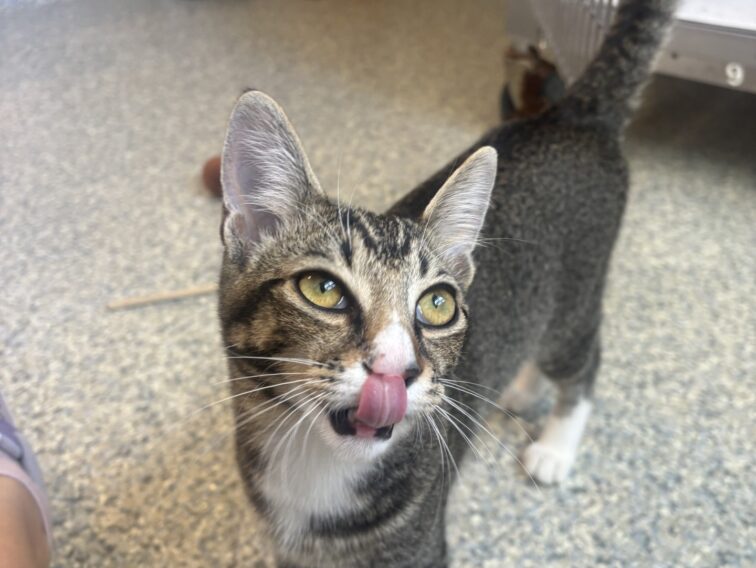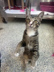Meet Kelci, a sweet and spunky gray kitten who’s ready to steal your heart! At just 4 months old, Kelci is full of kitten energy and curiosity, always on the lookout for her next toy to chase or cozy lap to curl up in. She may be small at 7 pounds, but Kelci’s personality is anything but! She’s affectionate, playful, and loves being around people. Whether she’s exploring her surroundings, engaging in a spirited game of pounce, or purring up a storm during cuddle time, Kelci brings joy wherever she goes. Kelci is looking for a forever home where she’ll be loved, spoiled, and treated like the little queen she is. She gets along well with gentle kids and could likely adjust to other pets with a proper introduction.