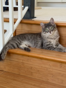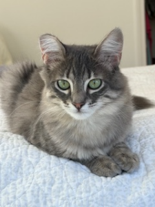 Misty is a 6 month old female – a medium-hair length, gray and white Tabby – her date of birth estimated to be Oct 2025. The white markings that orbit her celery-colored eyes highlight a gaze that says, “I’ve graduated”. With a white fluffy coat, extending from her chin to the under surface of a voluminous tail, she is dressed for success and ready for her new forever home.