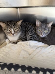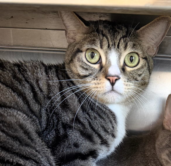 Ryan is the curious, wide-eyed half of this bonded duo. With his striking green eyes and classic tabby markings, he’s always alert and taking in the world around him. Ryan can be a little cautious at first, but once he feels safe, his gentle and affectionate nature starts to shine. He loves cozy hiding spots where he can observe quietly before joining in for pets and companionship. Ryan finds comfort in routine and in having his trusted companion, Meg, nearby—she helps him feel secure and confident.